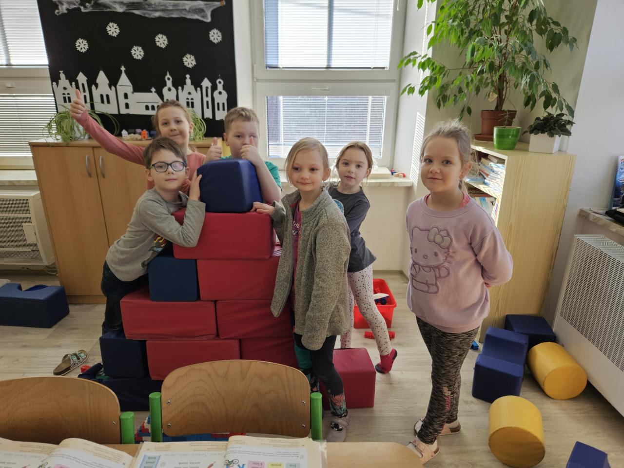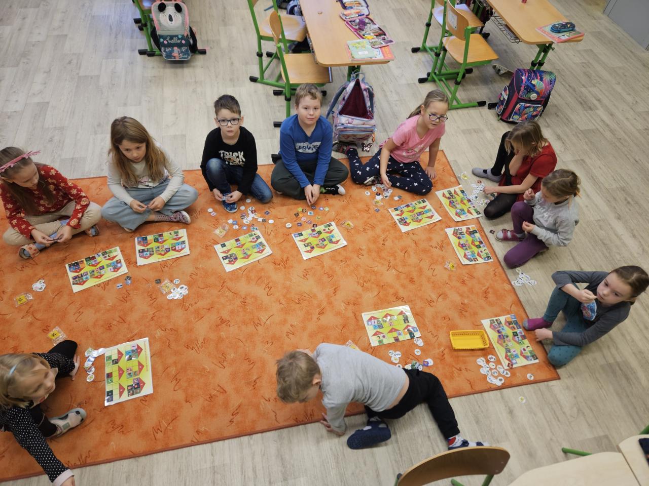 Standardní práce s prvňáčky, hry na koberci, skládání kartiček, postřehové soutěže, práce s tabulkou, fixace písmen aj.